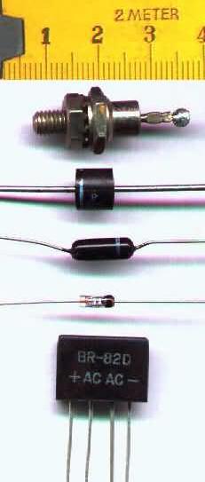 - Polovodičová dioda – je založena na P-N přechodu, který dovoluje tok proudu pouze jedním směrem.