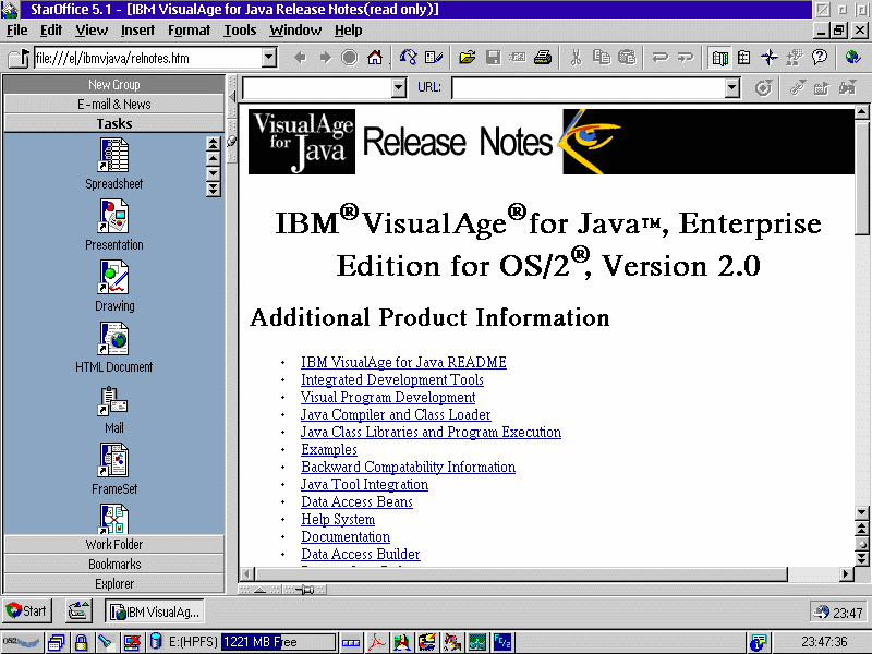 • Snímek nabízí HTML "Release Notes" k vývojovému prostředí jazyka Java -- IBM VisualAge for Java, Enterprise edition for OS/2, verze 2.0