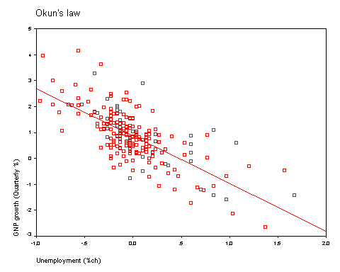 Graf + English: Okun's law. Quarterly GNP growth (NOT ANNUALIZED) and change in the unemployment rate. US data from US agencies from a file located here. Data from 2nd quarter 1947 through 4th quarter 2002. Made using SPSS.