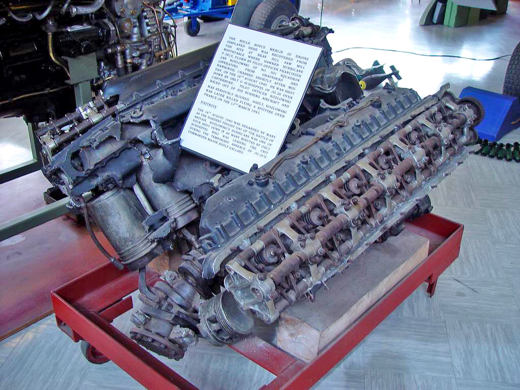 THE ROLLS-ROYCE MERLIN III ENGINE DISPLAYED HERE WAS RECOVERED FROM THE SITE AT BEAN HILL SAW MILL WHITSTABLE WHERE HAWKER HURRICANE P 3815, FLOWN BY PILOT OFFICER FRANCISZEK JAN KOZLOWSKI OF NO. 501 SQUADRON (OPERATING FROM GRAVESEND AND HAWKINGE) CRASHED SHORTLY AFTER MID-DAY, ON THE 18th AUGUST 1940. HE WAS SHOT DOWN BY OBLT G SCHOEPFEL OF JG. 26 OVER CANTERBURY. PILOT OFFICER KOZLOWSKI BALED [sic] OUT OF HIS BURNING AIRCRAFT AND WAS SERIOUSLY INJURED. SADLY, KOZLOWSKI WAS LATER KILLED FLYING A SPITFIRE OVER FRANCE ON THE 13th MARCH 1943