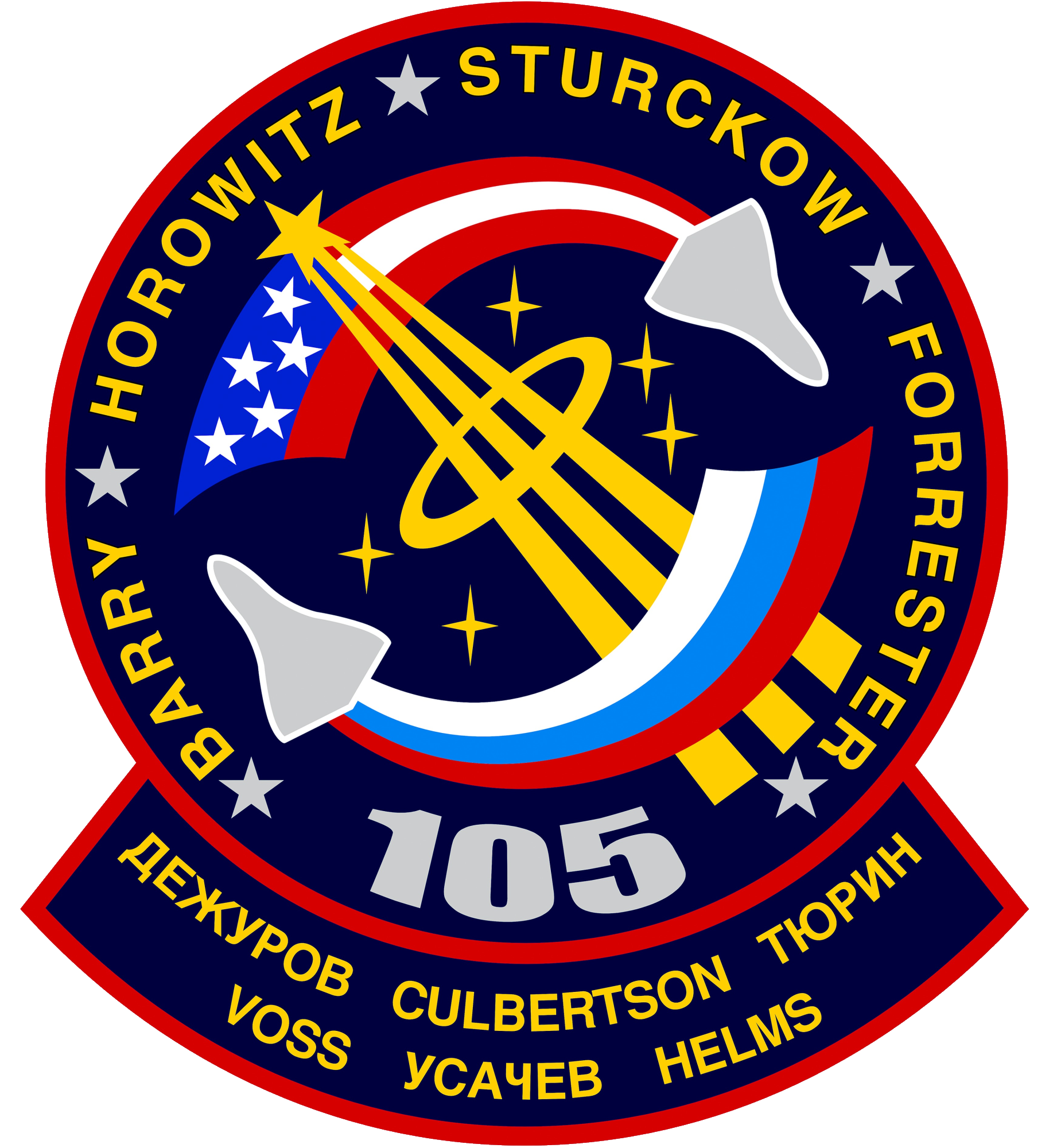 Oficiální znak + Description: The STS-105 crew patch symbolizes the exchange of the Expedition Two and Expedition Three crews aboard the International Space Station. The three gold stars near the ascending Orbiter represent the U.S. commanded Expedition Three crew as they journey into space, while the two gold stars near the descending Orbiter represent the Russian commanded Expedition Two crew and their return to Earth. The plumes of each Orbiter represent the flags of the United States and Russia and symbolize the close cooperation between the two countries. The Astronaut Office symbol, a star with three rays of light, depicts the unbroken link between Earth and the newest and brightest star on the horizon, the International Space Station (ISS). The ascending and descending Orbiters form a circle that represents both the crew rotation and the continuous presence in space aboard the ISS. The names of the four astronauts who will crew Discovery are shown along the border of the patch. The names of the Expedition Three and Expedition Two crews are shown on the chevron at the bottom of the patch. The NASA insignia design for Shuttle flights is reserved for use by the astronauts and for other official use as the NASA Administrator may authorize. Public availability has been approved only in the form of illustrations by the various news media. When and if there is any change in this policy, which we do not anticipate, it will be publicly announced.
