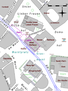 Historické jádro města má oválný tvar - na jedné straně je ohraničeno řekou Vezera (Weser), na druhé ho ohraničuje park vzniklý po zbourání barokních hradeb a vodní příkop ve tvaru hvězdy. V parku nalezneme i zachovalý větrný mlýn Mühle am Wall, ve kterém je dnes kavárna. Středem města je náměstí (Marktplatz), které je obklopeno výstavnými měšťanskými domy a celou řadou dominantních budov: radnice s renesanční fasádou ze 17. století, dóm St. Petra s vysokými věžemi, které tvoří panoráma města, a renesanční kupecký dům Schütting. Významnou památkou náměstí je desetimetrová socha rytíře Rolanda stojící před radnicí, která symbolizuje nezávislost a obchodní práva města. Socha Rolanda je spolu s radnicí od roku 2004 zapsaná na seznamu památek UNESCO.