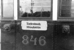 Protektorátní dvojjazyčný nápis – napřed německy Tiefenbach, pak česky Hloubětín.