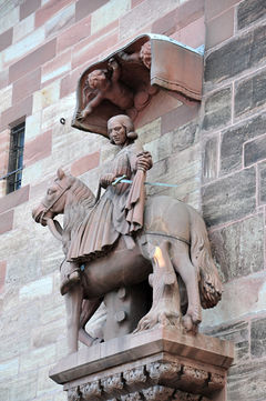 Původně se u hlavního vchodu nacházela socha Panny Marie a tympanonu byl zobrazen Poslední soud. Oboje však bylo v rámci obrazoborectví zničeno. Dnes jsou nalevo od hlavního vchodu sochy zakladatelů katedrály – Jindřicha II. (* 972, † 1024) a jeho manželky Gisely Burgundské. Jindřich je vyobrazen mladý, bez vousů; v ruce drží model katedrály na znamení, že on je jejím zakladatelem. Vpravo jsou dvě sochy mladých žen.