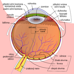 - Slepá skvrna – místo kde vystupuje z oční koule zrakový nerv, je bez tyčinek a čípků.