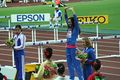 Vyhlášení vítězů desetiboje (zleva): stříbrný Maurice Smith, zlatý Roman Šebrle a bronzový Dmitrij Karpov. |