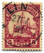 První poštovní známky vydané pro Německou východní Afriku spatřily světlo světa v roce 1893, jakožto přetisk (v měně peso) běžných německých známek, s přípisem „Německá východní Afrika“. V roce 1900 vydalo Německo tzv. „ Jachty“. Jachta byla součástí designu známek užívaných ve všech německých koloniích. Jednalo se o císařskou jachtu Hohenzollernů. V Německé východní Africe byly známky vyčísleny v pesos a rupiích (64 pesos = 1 rupie) a označeny nápisem Německá východní Afrika (Deutsch-Ostafrika). Roku 1905 byly vytištěny nové poštovní známky v hodnotovém systému haléřů (100 haléřů = 1 rupie). Němci pokračovali v tisku dalších známek, i přes špatnou situaci během 1. světové války a od roku 1916 vydávali vodotiskovou známku s jachtou v hodnotě 1 rupie (pravá používaná známka z této doby je velkou raritou a dnes má hodnotu více než 20 tisíc amerických dolarů). Prodejní hodnota většiny typů známek z Německé východní Afriky se dnes pohybuje pod 10 amerických dolarů, ale známky s vysokou nominální hodnotou a rané tisky dosahují ceny až k 100 $. Poté co byla kolonie obsazena britskými a belgickými jednotkami, každá z nich vydala své vlastní provizorní známky. V roce 1916 Belgičané přetiskli známky Belgického Konga v několika verzích. První verze s nápisem „ Ruanda a Urundi, nebyla nikdy skutečně užívána. Druhá série známek byla přetištěna s dvojjazyčným nápisem „ Německá východní Afrika/Okupace Belgií “ ve francouzštině a vlámštině. V roce 1922 byly známky přeceněny a pohybovaly se v hodnotách 5 až 50 centů. Britové zpočátku přetiskli známky, které užívali v protektorátu Nyasaland v dnešním Malawi s titulkem N.F. znamenajícím Nyasaland Force. V roce 1917 změnili tento přetisk na zkratku G.E.A. (German East Africa) a následně na známky „ Východní Afriky a Ugandy“. Ten samý přetisk se objevil na známkách s hlavičkou Východní Afrika a Protektorát Uganda, ale tyto známky byly vydávány až po ustavení Tanganiky a jsou považovány za součást poštovní historie Tanganiky.