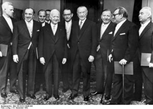Pátý Adenauerův kabinet (21. 12. 1962): zleva: Ewald Bucher, Werner Dollinger, Rainer Barzel, spolkový prezident Heinrich Lübke, Rolf Dahlgrün, Konrad Adenauer, Alois Niederalt, Hans Lenz a Bruno Heck.