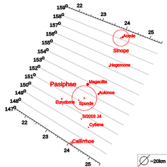 Eurydome • S/2003 J 23 • Hegemone • Pasiphae • Sponde • Cyllene • Megaclite • S/2003 J 4 • Callirrhoe • Sinope • |