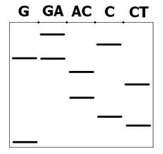 Všechny sekvence DNA se následně umístí vedle sebe do polyakrylamidového gelu a spustí se elektroforéza. Tato metoda způsobí, že se v gelu seřadí všechny sekvence podle své délky: nejdále v gelu doputují ty nejkratší sekvence. Dalším krokem je vystavení tohoto gelu rentgenovému záření, čímž jsou všechny sekvence s 3' koncem označeným radioaktivním fosforem najednou v gelu patrné jako svítící proužky (metoda označovaná jako autoradiografie[11]). Nakonec se podle pozice těchto proužků ve srovnání s ostatními proužky vyhodnocuje, jaké bylo původní řazení nukleových bází ve vzorku DNA.[10]