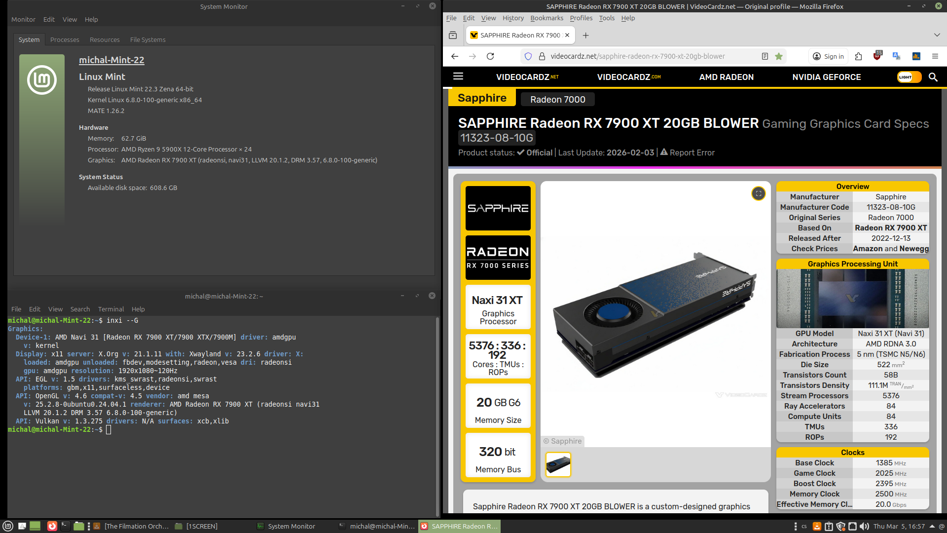 - Česky: Zcela nová grafická karta Sapphire Radeon RX 7900 XT 20GB BLOWER perfektně funguje v operačním systému Linux Mint 22.3 Zena !