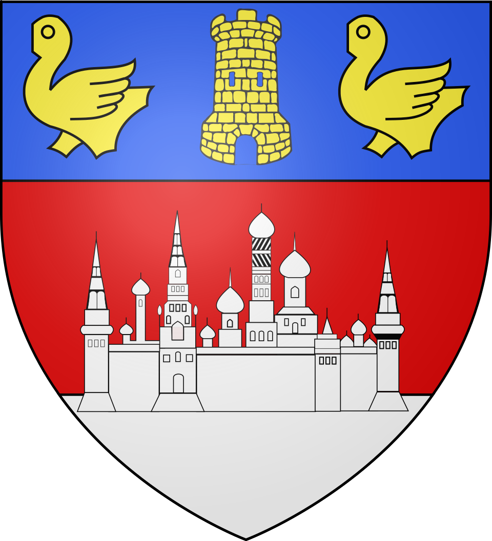 - English: Gules a Kremlin on a terrace argent, on a chief cousu azure a tower or door and windows of the field between two merlettes or
