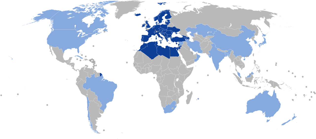 • Countries with one or more members are in dark blue. Associated members in light blue.