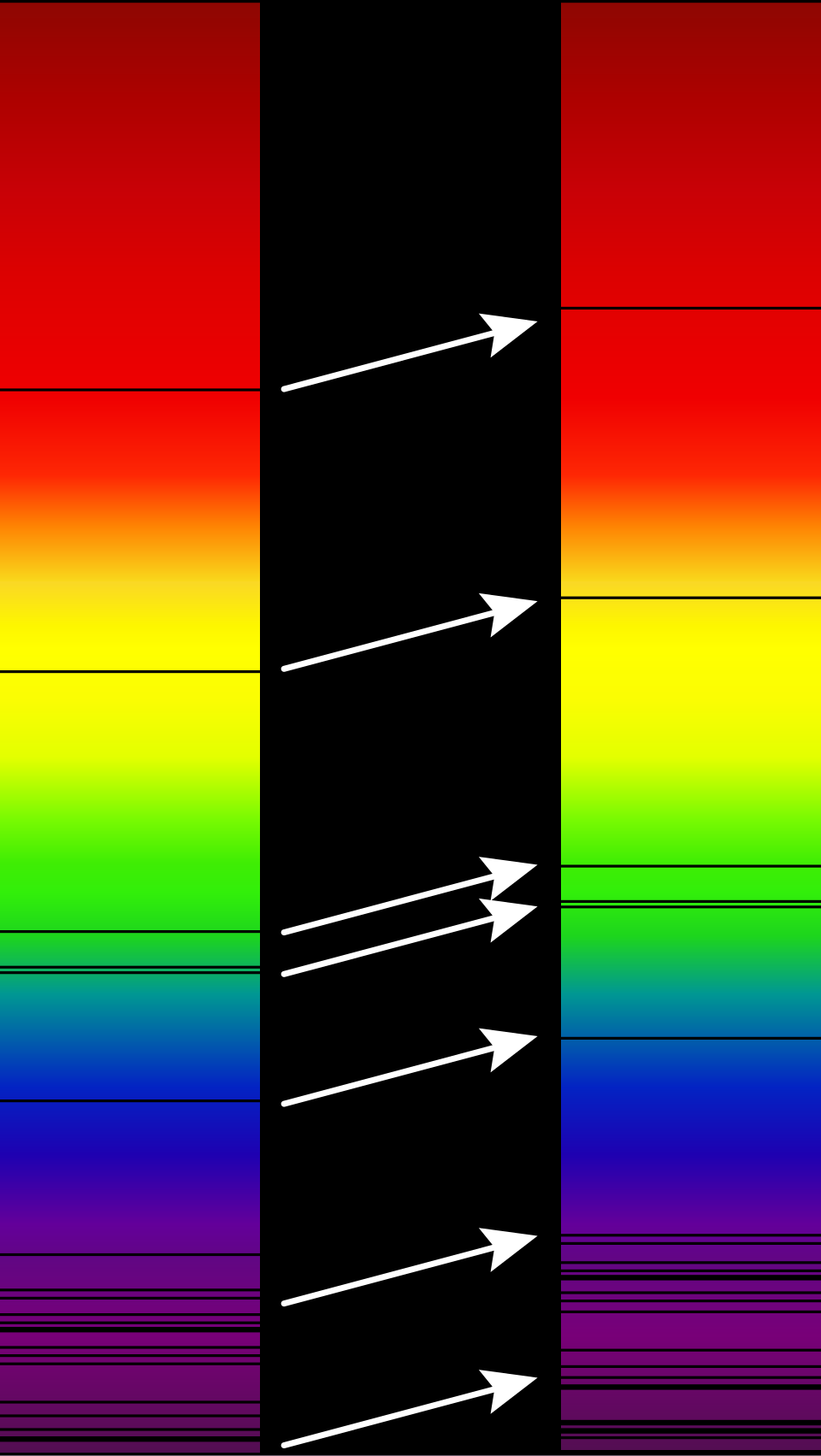 - English: Absorption lines in the optical spectrum of a supercluster of distant galaxies (BAS11) (right), as compared to those in the optical spectrum of the Sun (left). Arrows indicating Redshift.