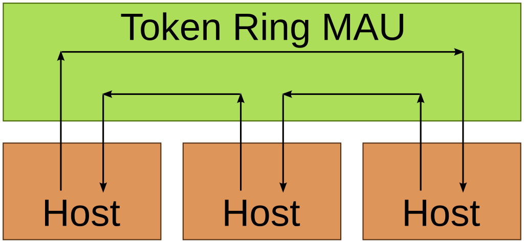 Obrázek + Description: Token Ring LAN Logical Network Layout with three hosts connected to a Multi-station Access Unit (MAU). Ring in/out ports are not shown for simplicity.