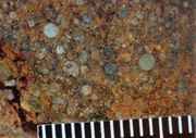 - Chondrit je meteorit složen především z křemičitanů.[3] Na průřezu jsou patrné kulové granule, které se jmenují chondrule. Tyto útvary daly tomuto typu meteoritů jeho jméno. Jsou složeny především z olivínu a pyroxenu. V pozemských podmínkách jsou velmi reaktivní a rychle se erodují.