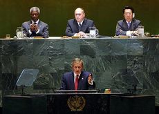 [[Soubor:Bush 2002 UNGA.jpg|thumb|Prezident Bush před [[Valné shromáždění OSN|Valným shromážděním OSN]] 12. září 2002. ]]